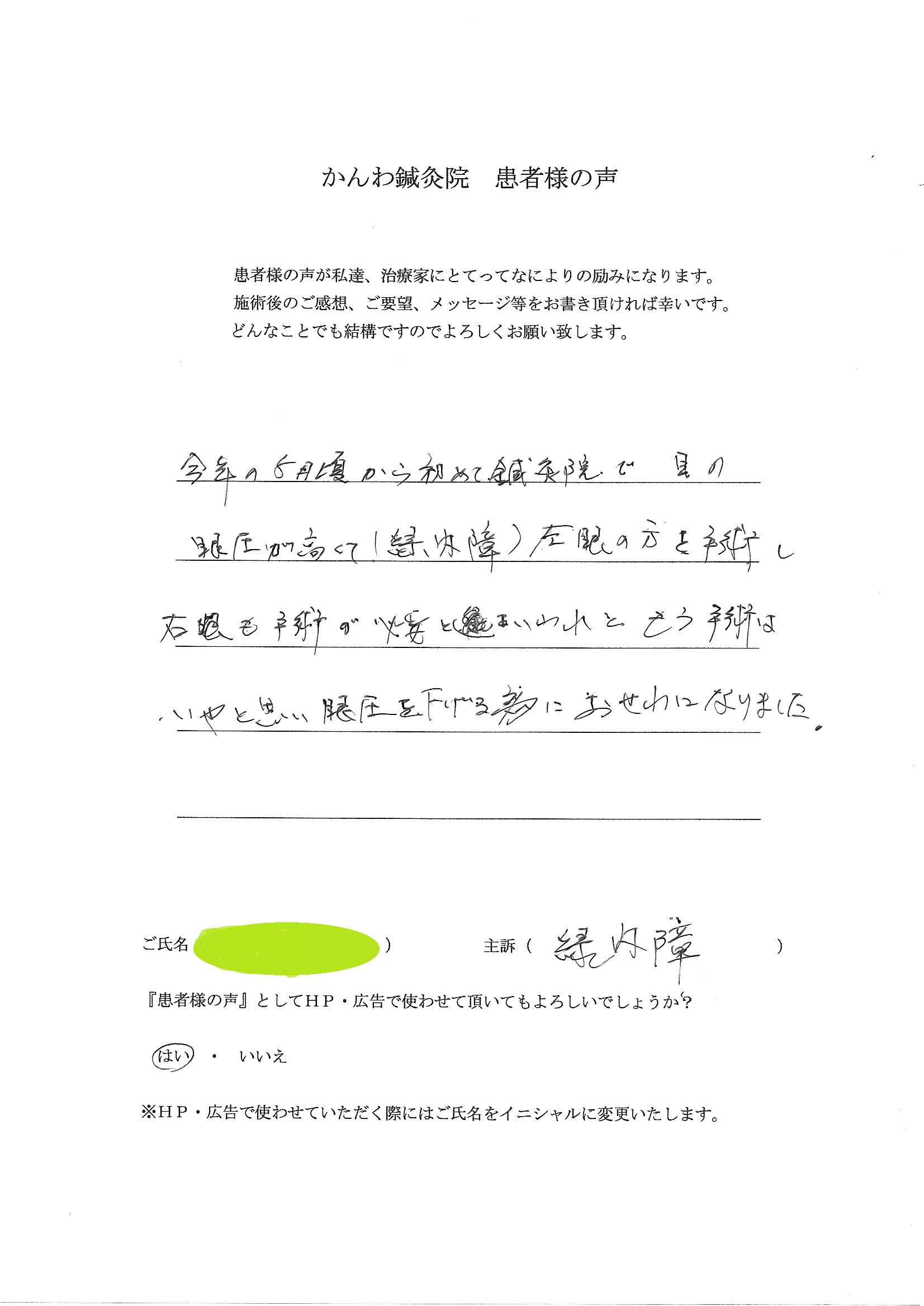 今年の5月頃から初めて鍼灸院で、目の眼圧が高くて(緑内障)左眼の方を手術し右眼も手術が必要といわれて、もう手術はいやと思い眼圧を下げる為に、お世話になりました。