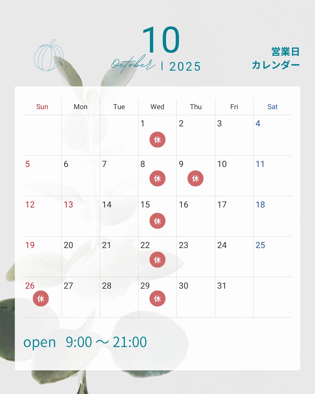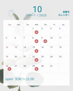 10月は上記の通りで営業いたします。↑クリックで拡大してご確認いただけます。